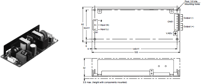 | 110g (샤시 커버 제외) | | | | | | | | | | | * 1. 인버터에 따라서는 출력 사양으로 출력 주파수를 50/60Hz로 표시하는 경우도 있지만 파워 서플라이의 내부 온도 상승으로 인해 발연 · 소손의 우려가 있으므로 인버터의 출력을 파워 서플라이의 전원으로 사용하지 마십시오. * 2. V.ADJ 볼륨을 조작하면 전압 가변 범위의 +10 % 이상 전압이 상승합니다. 출력 전압을 가변 하는 경우에는 전원의 출력 전압을 확인하고 부하를 파손시키지 않도록 주의하시기 바랍니다. * 3 정격 입력 전압 (AC100V 또는 AC200V) 100 % 부하에서 규정합니다. JEITA 규격 RC-9131A에 준한 측정 방법입니다. 상세한 내용은 사용 전에 ● 리플 노이즈 전압 을 참조하십시오. * 4. 복귀 시에는 입력 전원을 OFF하고 3 분 이상 방치한 뒤, 입력 전원을 재투입 해주십시오. * 5. 무게는 오픈 타입입니다. * 6. EC 지침 및 각종 안전 규격 (UL, EN, 기타) 적용은 AC100 ~ 240V (AC85 ~ 264V)입니다. * 7. 제품 아래에 알루미늄 플레이트를 깐 상태에서 class B에 적합합니다.